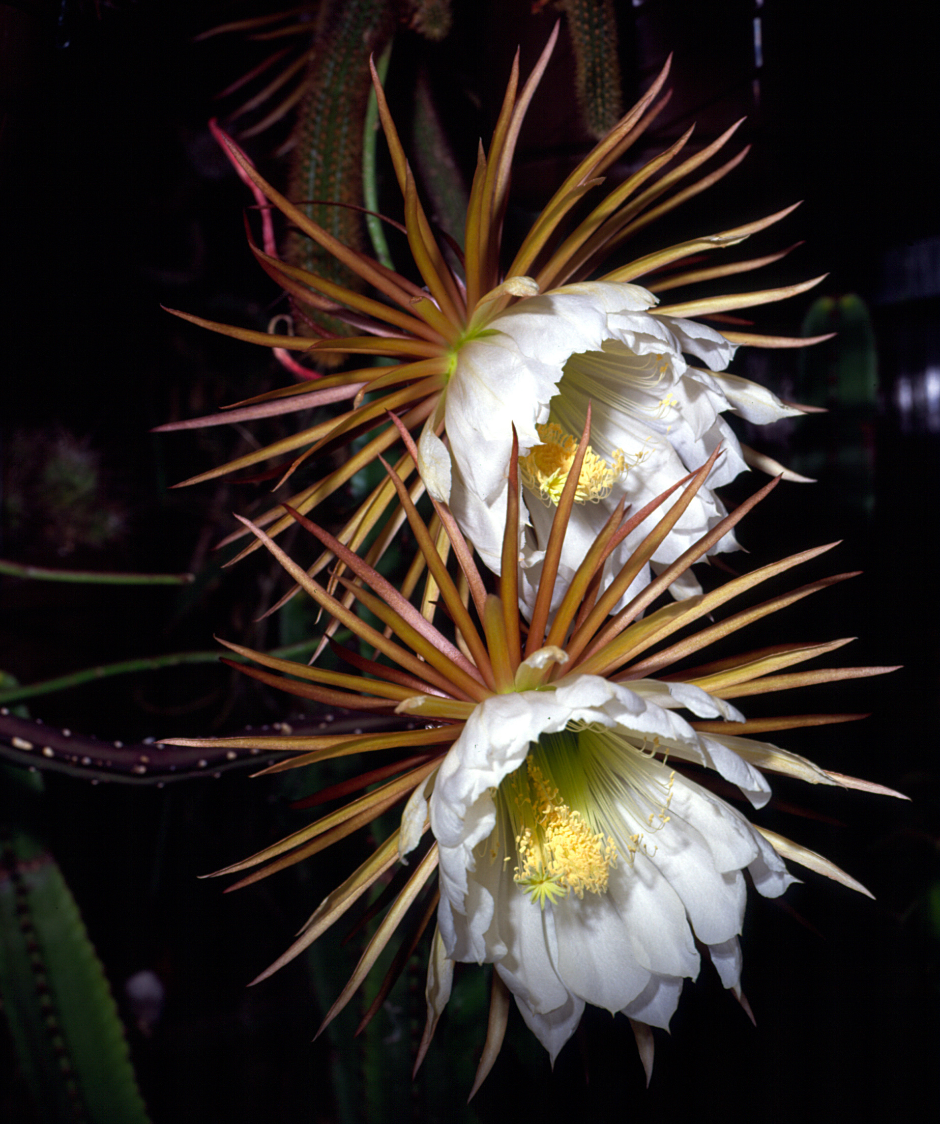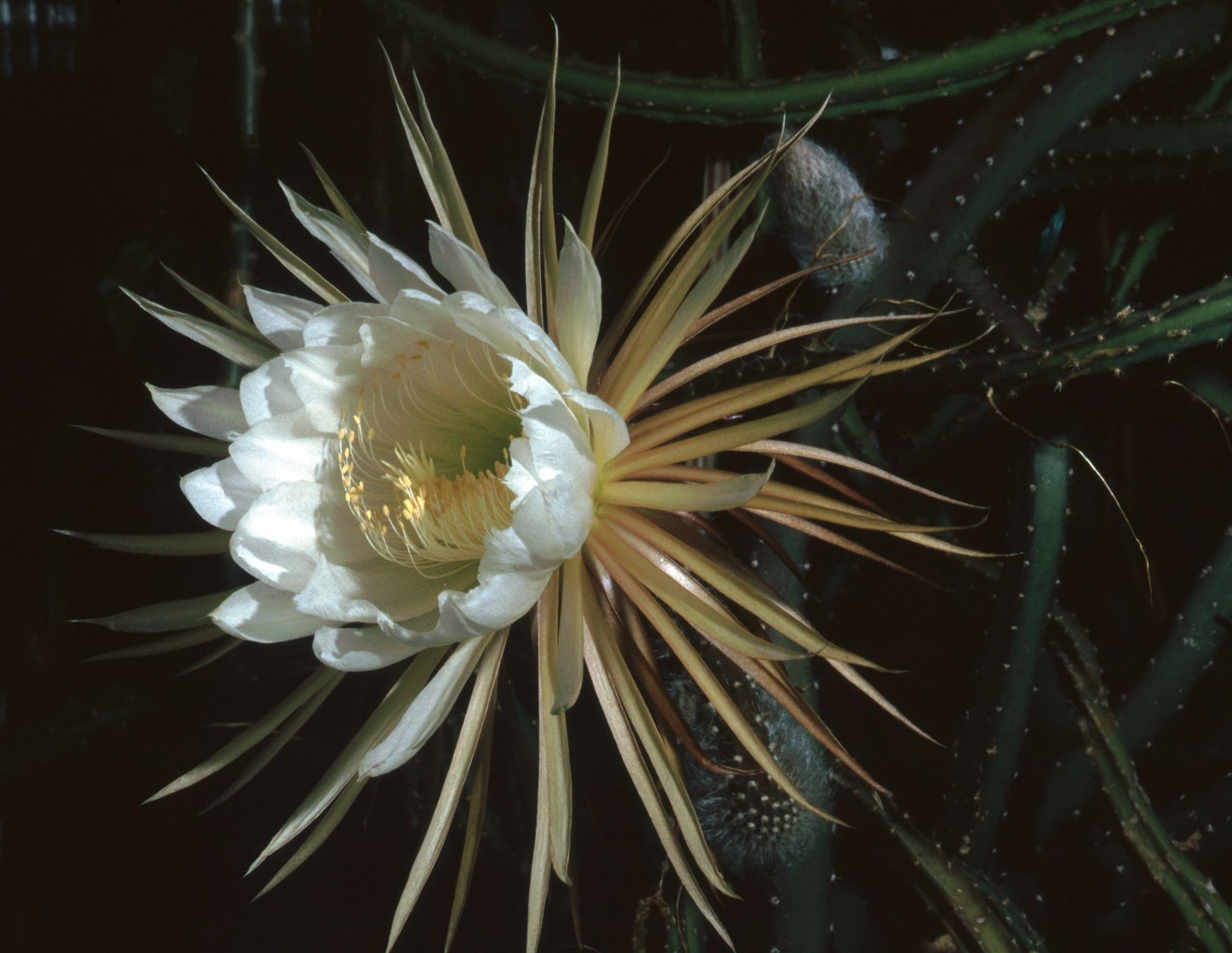 Seinem volkstümlichen Namen „Königin der Nacht“ macht dieser Kaktus alle Ehre. Tagsüber das hässliche Entchen unter den Kakteen, mausert er sich zur Blütezeit nachts zu einem schönen Schwan. Mit seinem schlangenartigen, graugrünen Körper von etwa 2,5 cm Durchmesser wird er von Laien meistens als langweilig oder gar hässlich eingestuft. Wenn sich jedoch zur Blütezeit im Frühling und im Hochsommer die prachtvollen Blüten – innen cremeweiß, außen gelblich – entfalten, die einen Durchmesser bis zu 30 cm haben können und einen angenehmen Vanilleduft ausströmen, ist das Erstaunen groß. Die strahlenförmigen Blüten öffnen sich bei beginnender Dunkelheit relativ rasch, haben bis Mitternacht ihre volle Größe erreicht und sind bei Tagesanbruch bereits wieder verblüht.