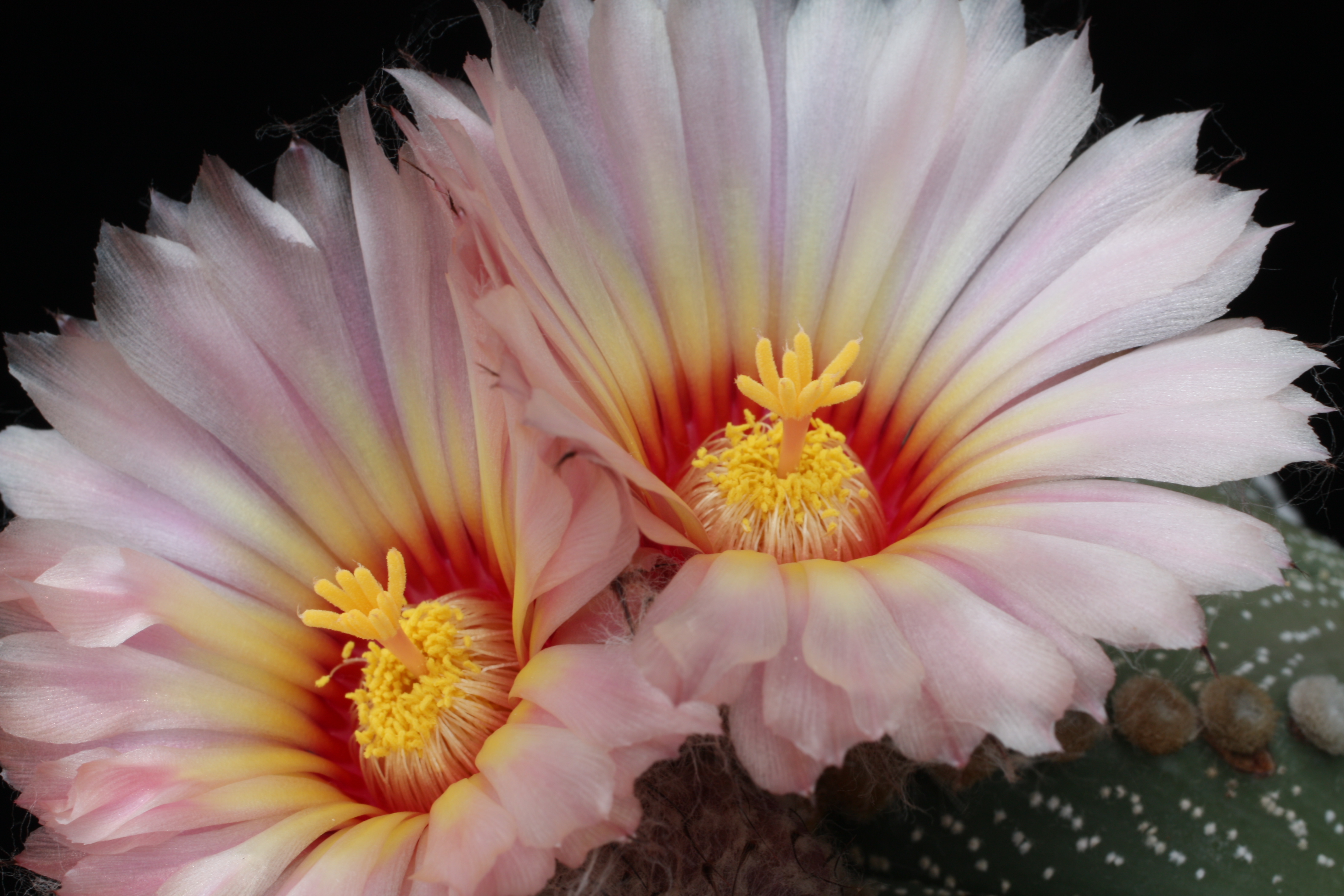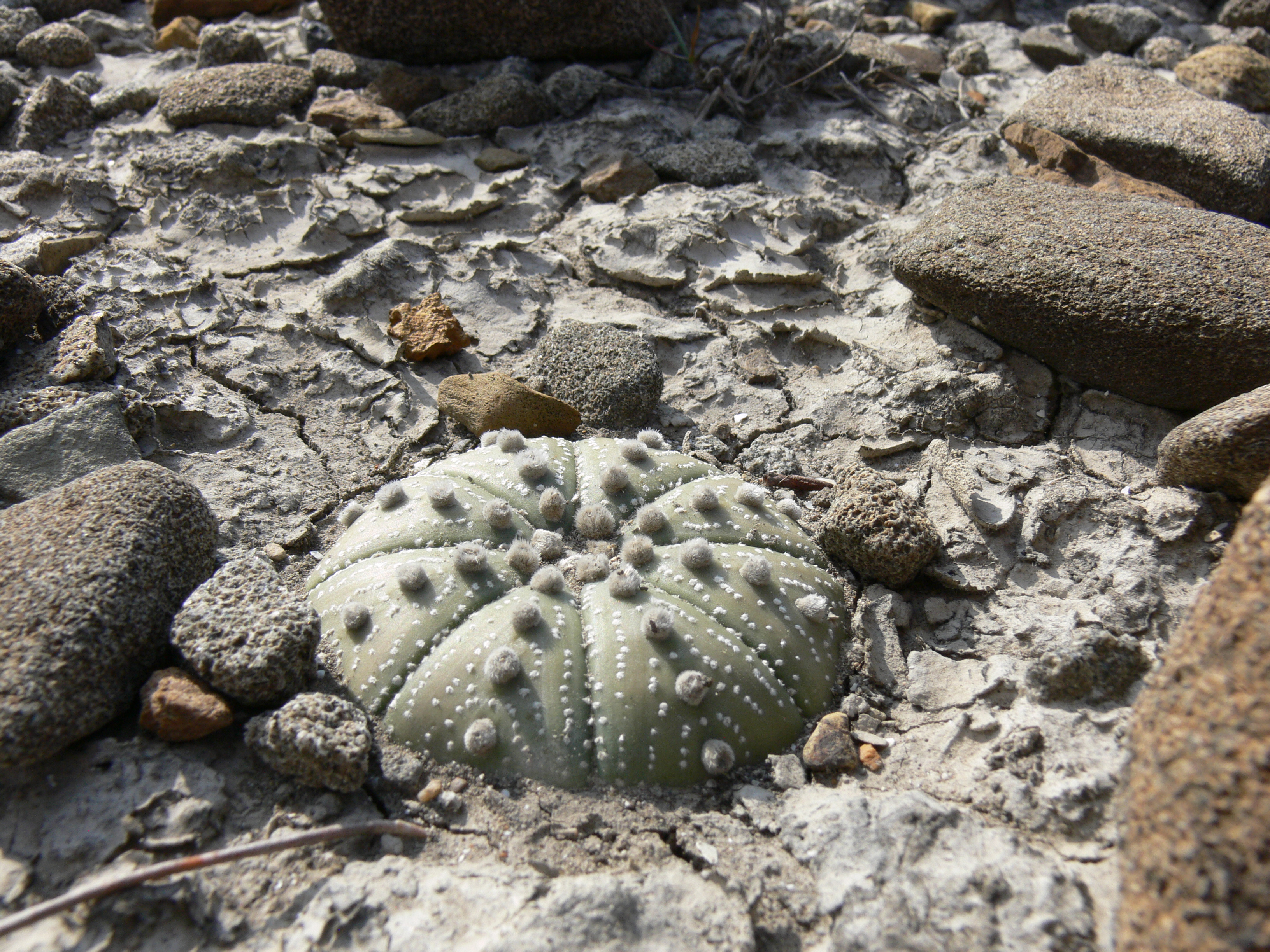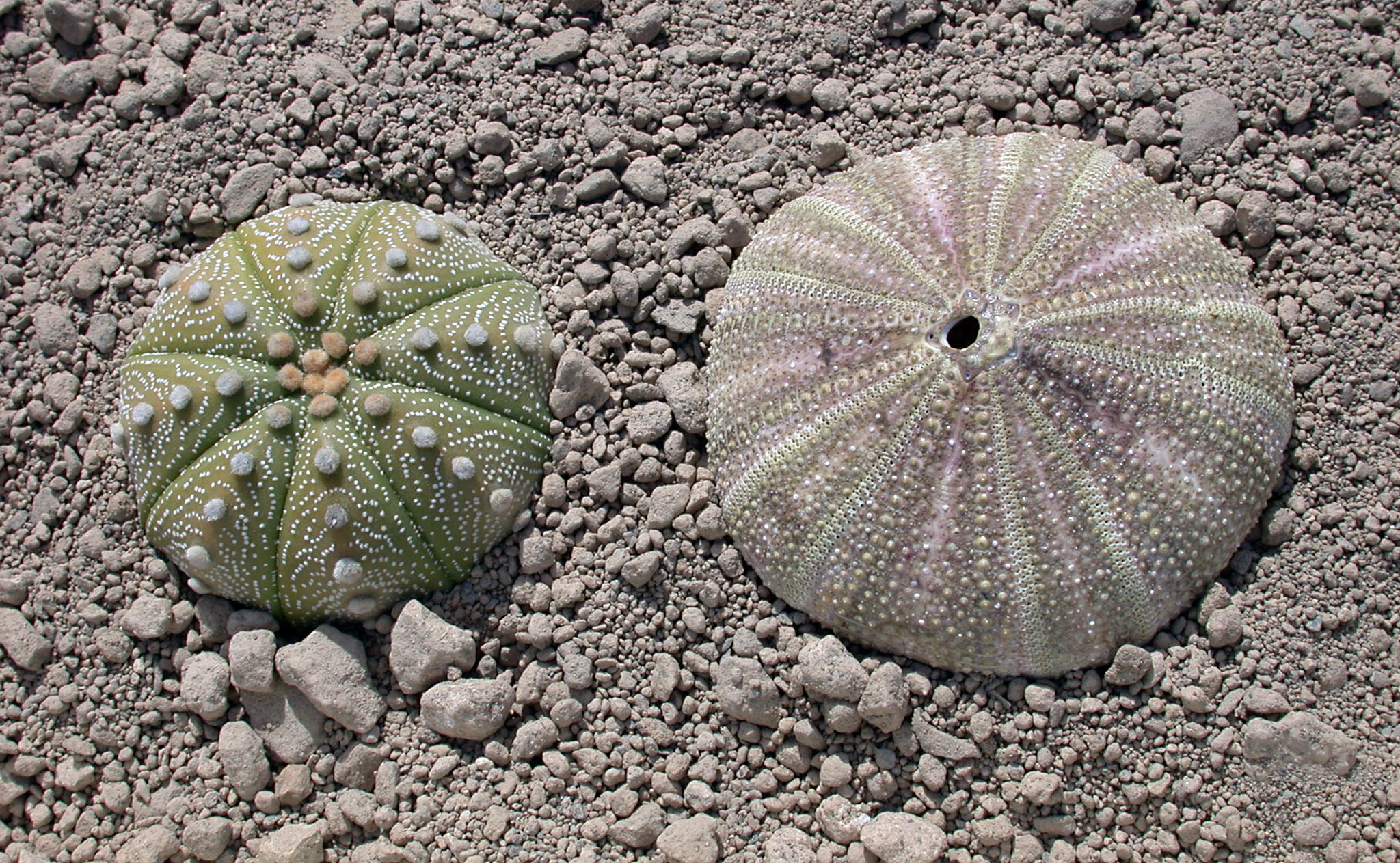 Wie sehnlich die Kakteenwelt auf das Astrophytum asterias gewartet hatte, zeigte sich im Preis, der dafür erzielt wurde. So kostete 1924 eine Pflanze von 4 cm Durchmesser 40 Mark, was den halben Monatslohn eines Industrie­arbeiters in guter Stellung bedeutete. Obwohl die Bezeichnung „asterias“ eigentlich auf den Seestern hindeutet, bürgerte sich bei uns die Benennung Seeigelkaktus ein, was auf die frappierende Ähnlichkeit des Pflanzenkörpers mit der Schale des Seeigels hinweist. Auch im Pflanzenreich hat sich im Verlauf der Evolution eine verblüffende Konvergenz herausgebildet. In Südafrika findet man mit dem Wolfsmilchgewächs Euphorbia obesa eine Sukkulente, die sich unter ähnlichen Umweltbedingungen täuschend ähnlich entwickelte.