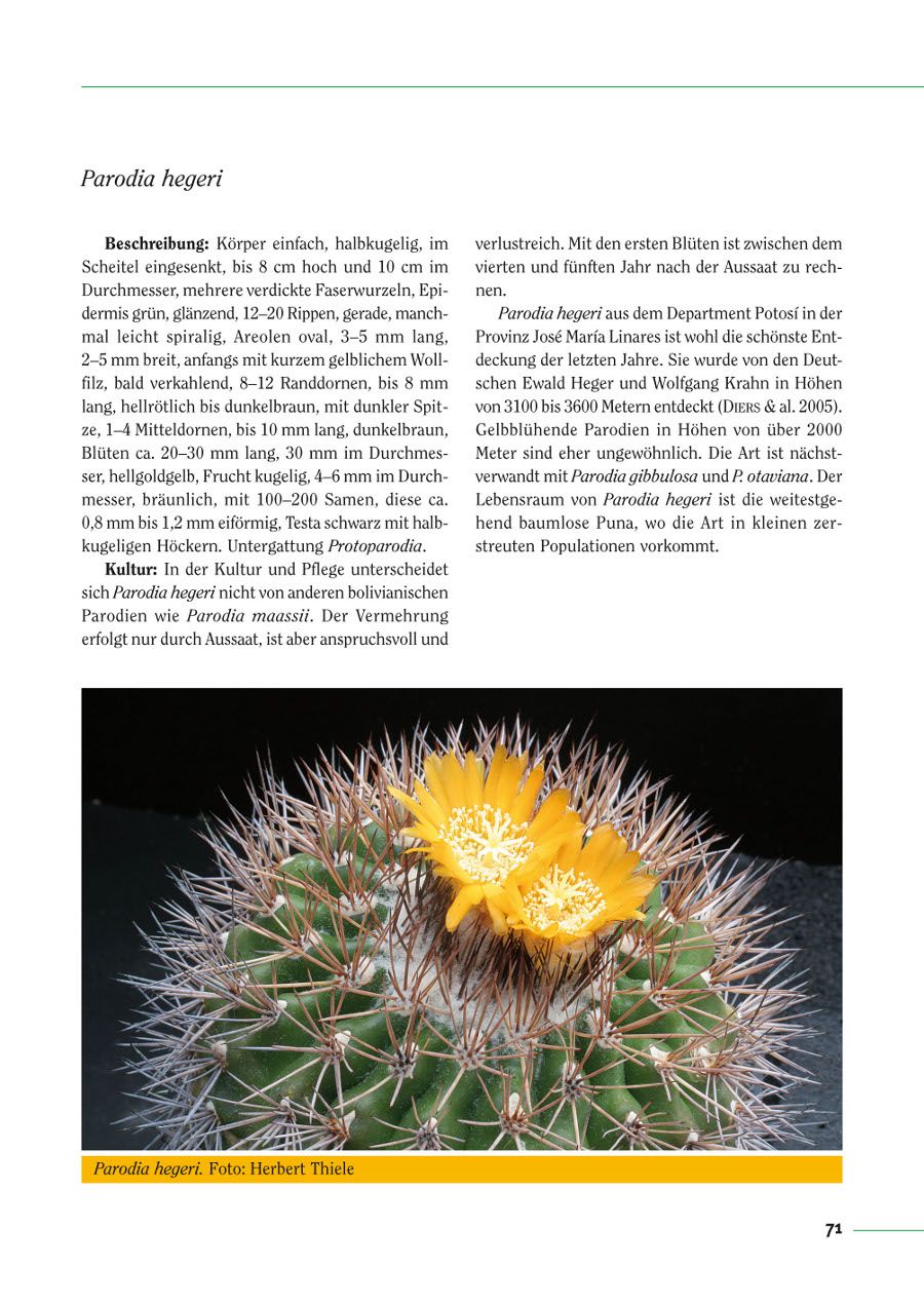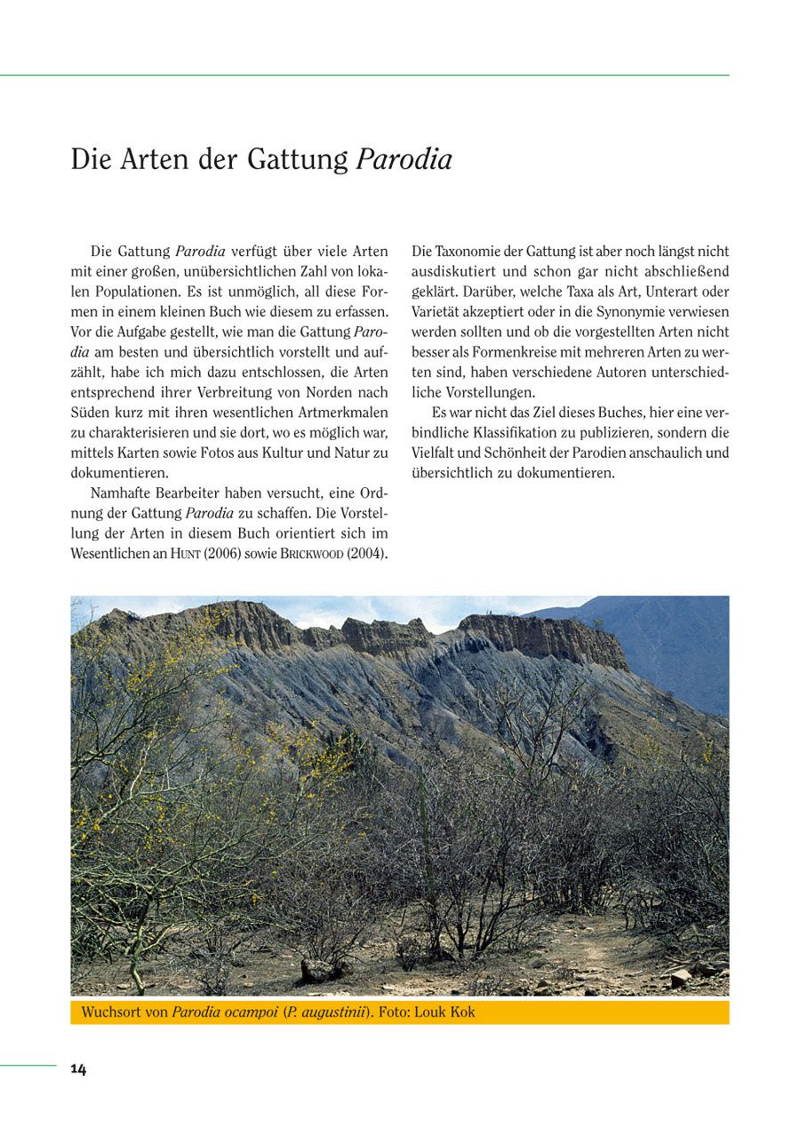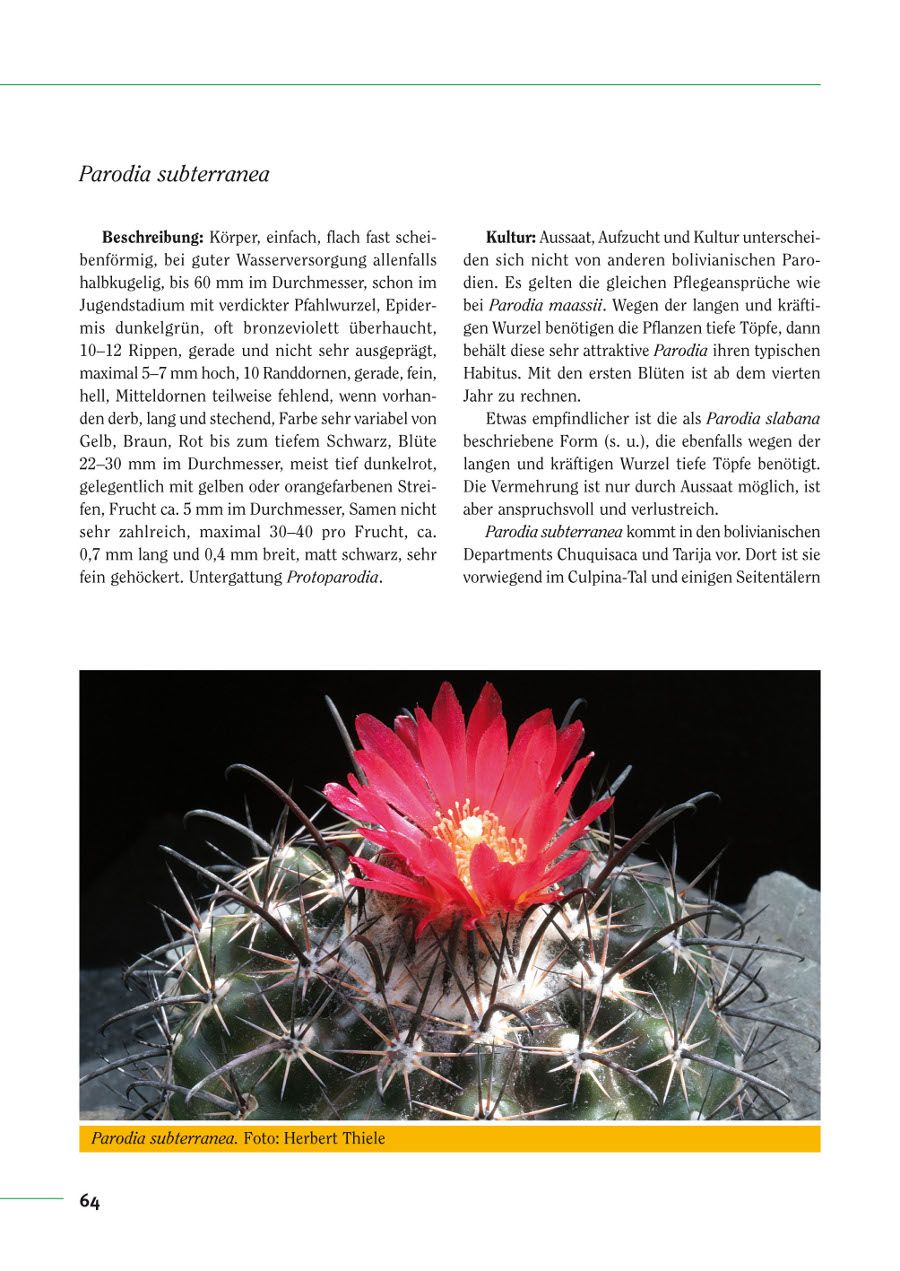 Die Arten der fast vergessenen Kakteengattung Parodia, eine attraktive Gruppe von Kugelkakteen aus Bolivien und Argentinien, werden in Text und Bild vorgestellt. Für den Kakteenliebhaber gibt es viele Hinweise zur Kultur und die 189 Farbfotos machen den Band zu dem am reichhaltigsten illustrierten Buch über diese Gattung.