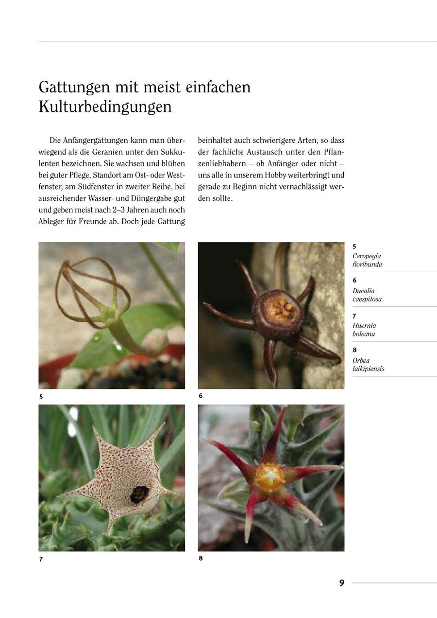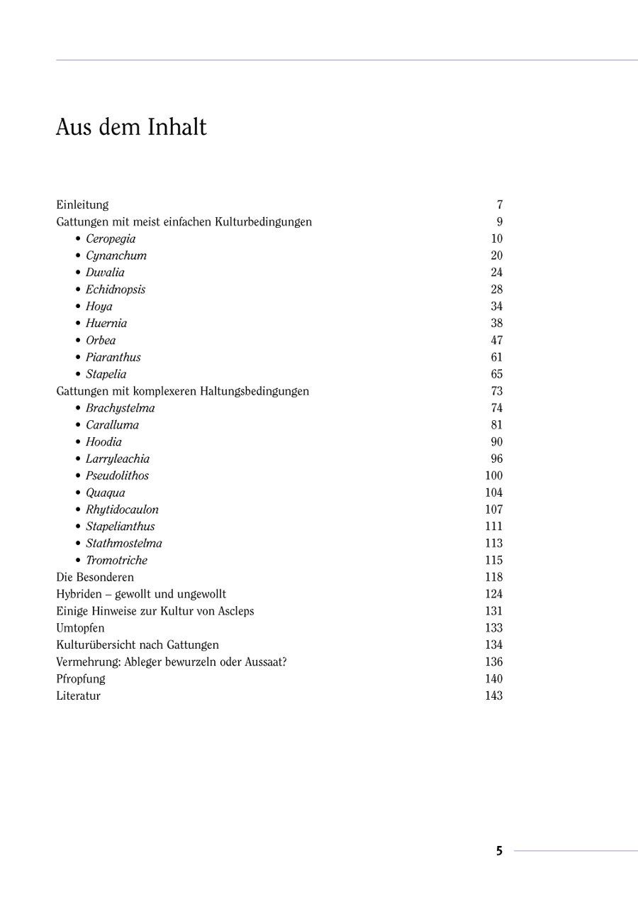 Eine Einführung in die Welt der sukkulenten Asclepiadaceen, die sich nicht nur an die Liebhaber dieser Pflanzen richtet. Der Leser erfährt in verständlicher Form alles über Geschichte, Vorkommen, Gattungen, Hybriden und Haltungsbedingungen. Eine Kulturübersicht und Hinweise zur Vermehrung schließen die Publikation ab.
